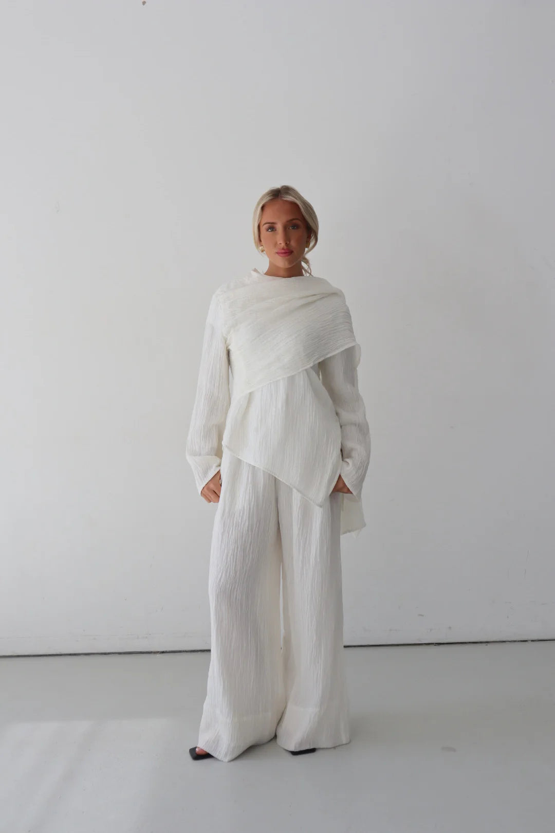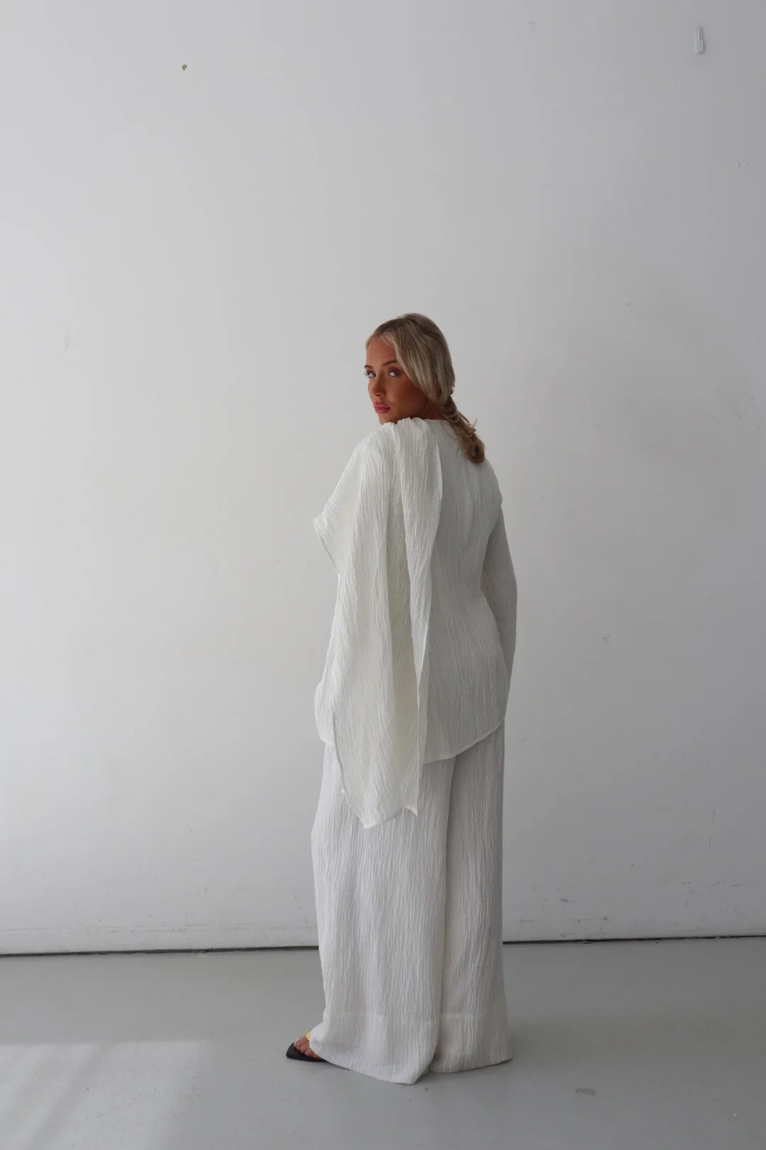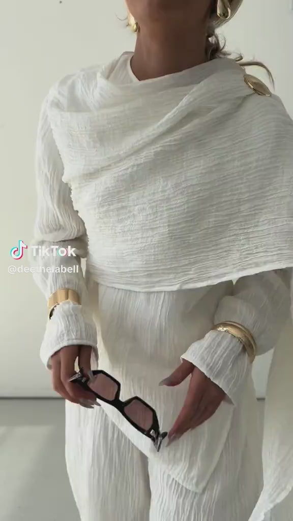 A modern two-piece ensemble featuring a softly textured cape-style top paired with flowing wide-leg trousers. Designed with graceful draping and a relaxed fit, this set blends modest elegance with contemporary style. Ideal for special gatherings, evening wear, or elevating everyday looks with refined simplicity.